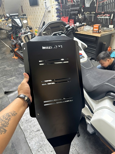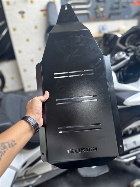 - Tăng cường vẻ ngoài hầm hố: Với thiết kế góc cạnh, mạnh mẽ và màu đen lì, tấm lót gầm không chỉ có chức năng bảo vệ mà còn góp phần nâng cao tính thẩm mỹ, mang lại vẻ ngoài cứng cáp và phong cách hơn cho chiếc Goldwing sang trọng của bạn. Dòng chữ “LK CUSTOM” được cắt trên tấm lót cũng là một điểm nhấn cá tính.