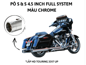 Pô S&S Cycle Full System đường kính 4.5 inch màu chrome, mã sản phẩm 550-0851, được thiết kế cho các dòng Harley-Davidson Touring từ năm 2017 trở lên. Đây là một hệ thống ống xả toàn diện, thay thế cả cổ pô và lon pô zin, giúp tối ưu hóa luồng khí thải và cải thiện đáng kể hiệu suất động cơ Milwaukee-Eight. Lớp mạ chrome sáng bóng mang lại vẻ ngoài cổ điển, sang trọng và nổi bật, tôn lên vẻ đẹp của chiếc Touring. S&S nổi tiếng với khả năng tạo ra âm thanh uy lực, trầm ấm và đặc trưng, làm hài lòng những biker yêu thích tiếng nổ “chuẩn Harley” đồng thời nâng cao công suất và mô-men xoắn.